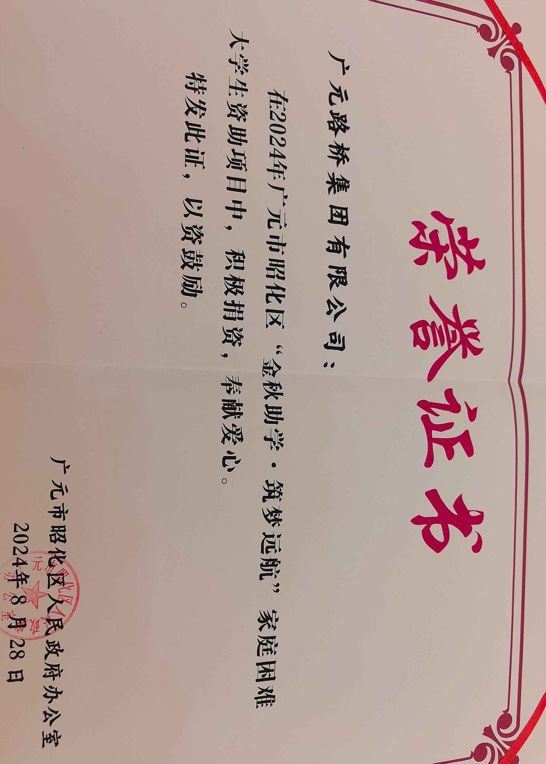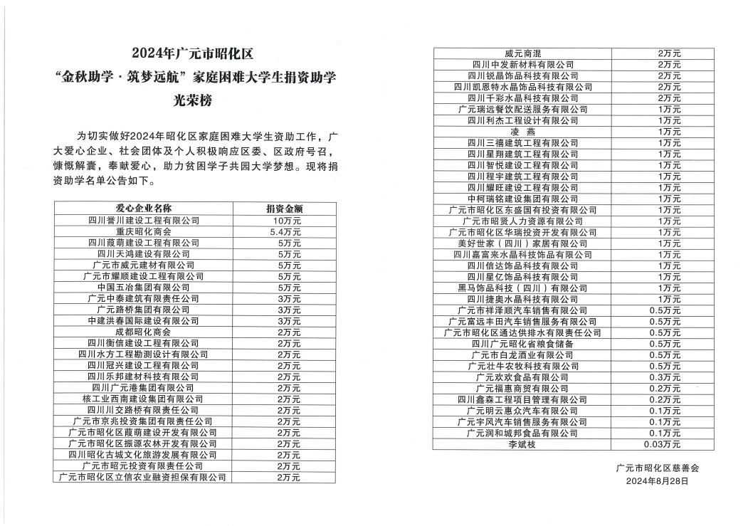 8月28日,昭化区举行2024年“金秋助学·筑梦远航”家庭难题大学生资助仪式,3044am永利集团集团作为资助企业参会并获得表扬 。
